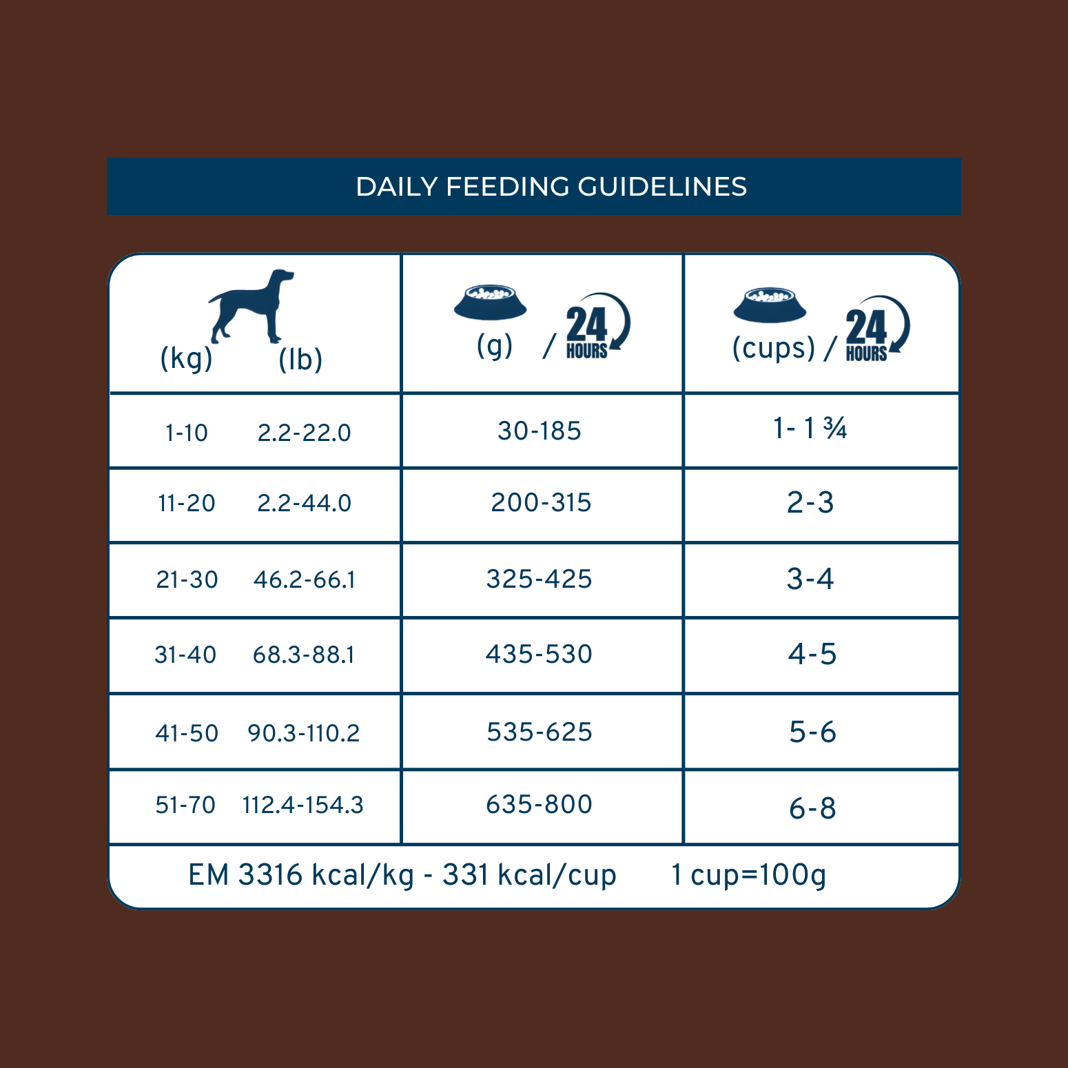 3316 Kcal/kg, 331 kcal/cup