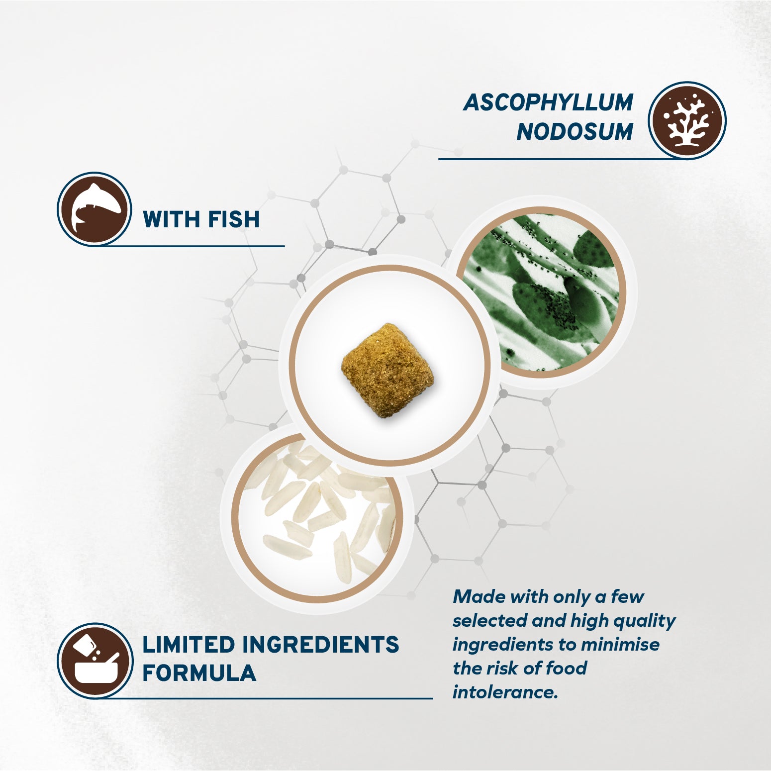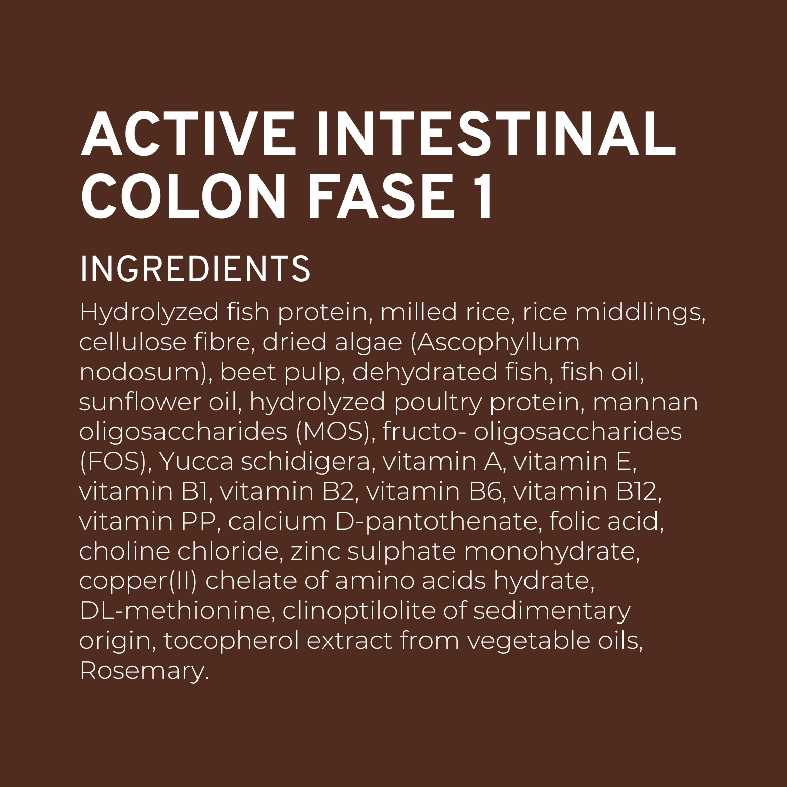 Hydrolyzed fish protein, milled rice, rice middlings, cellulose fibre, dried algae (Ascophyllum nodosum), beet pulp, dehydrated fish, fish oil, sunflower oil, hydrolyzed poultry protein, mannan oligosaccharides (MOS), fructo-oligosaccharides (FOS), Yucca schidigera, vitamin A, vitamin E, vitamin B1, vitamin B2, vitamin B6, vitamin B12, vitamin PP, calcium D-pantothenate, folic acid, choline chloride, zinc sulphate monohydrate, copper(II) chelate of amino acids hydrate, DL-methionine, clinoptilolite of sedimentary origin, tocopherol extract from vegetable oils, Rosemary.