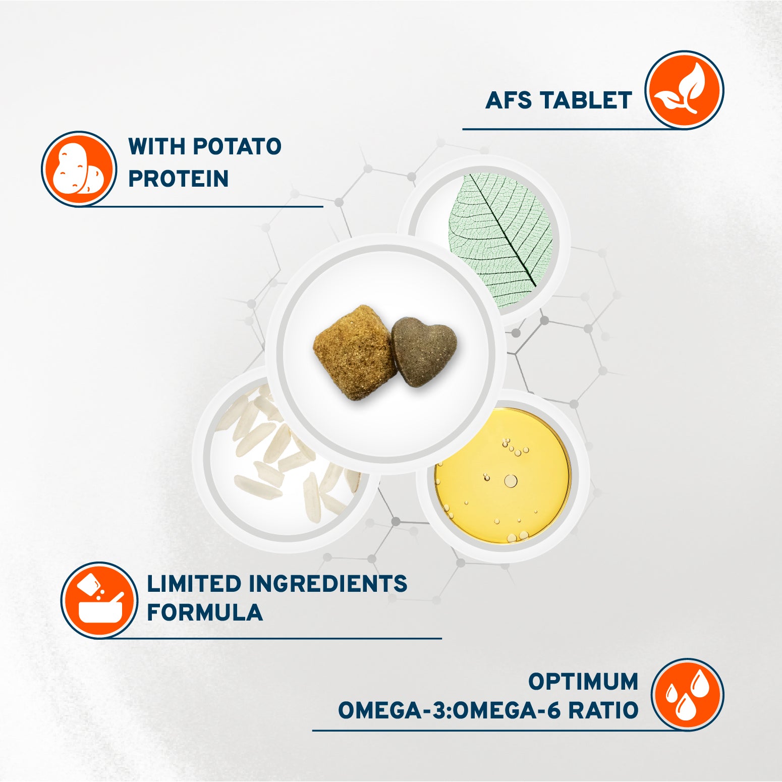 Milled rice, pea starch, chicken fat, potato protein, ((AFS tablet – 7% of the food): potato protein, hydrolyzed fish protein, mouse-ear hawkweed, products from the processing of herbs (Lespedeza spp.), dried fruit pomace (Vaccinium macrocarpon), bearberry leaves)), beet pulp, rice middlings, dried algae (Ascophyllum nodosum), fish oil, sunflower oil, hydrolyzed poultry protein, mannan oligosaccharides (MOS), fructo-oligosaccharides (FOS), Yucca schidigera, vitamin A, vitamin E, vitamin B1, vitamin B2, vitamin B6, vitamin B12, vitamin PP, calcium D-pantothenate, folic acid, choline chloride, zinc sulphate monohydrate, copper(II) chelate of amino acids hydrate, DL-methionine, clinoptilolite of sedimentary origin, tocopherol extract from vegetable oils, Dandelion, Rosemary.