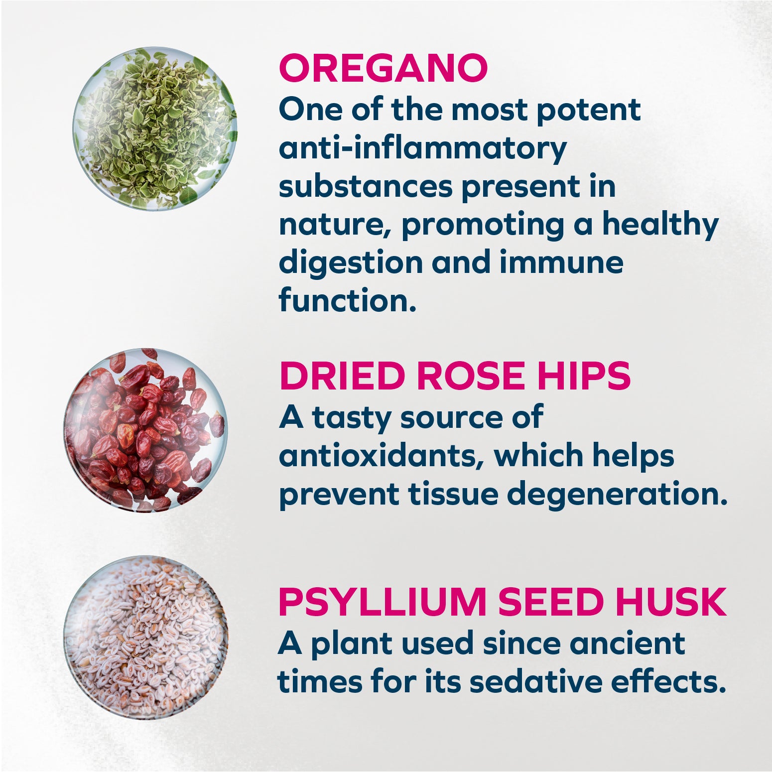 - Oregano, rose hips, and psyllium seed husk are added to help support a healthy digestion